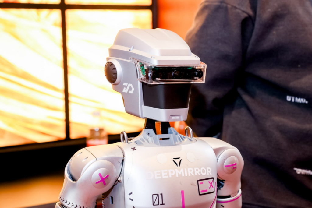 这一设计不是为了标新立异,而是源于对具身智能落地痛点的深刻洞察。宸境科技联合创始人兼COO颜沁睿讲了一个真实的故事:他们在与合作伙伴深入交流后发现,当那些明星级的机器狗或人形机器人去参加WAIC这种大型展会时,一旦被热情的观众围得水泄不通,机器人就“瞎”了。为什么?因为传统的横向摄像头看出去,满眼全是晃动的人腿和走来走去的人群。